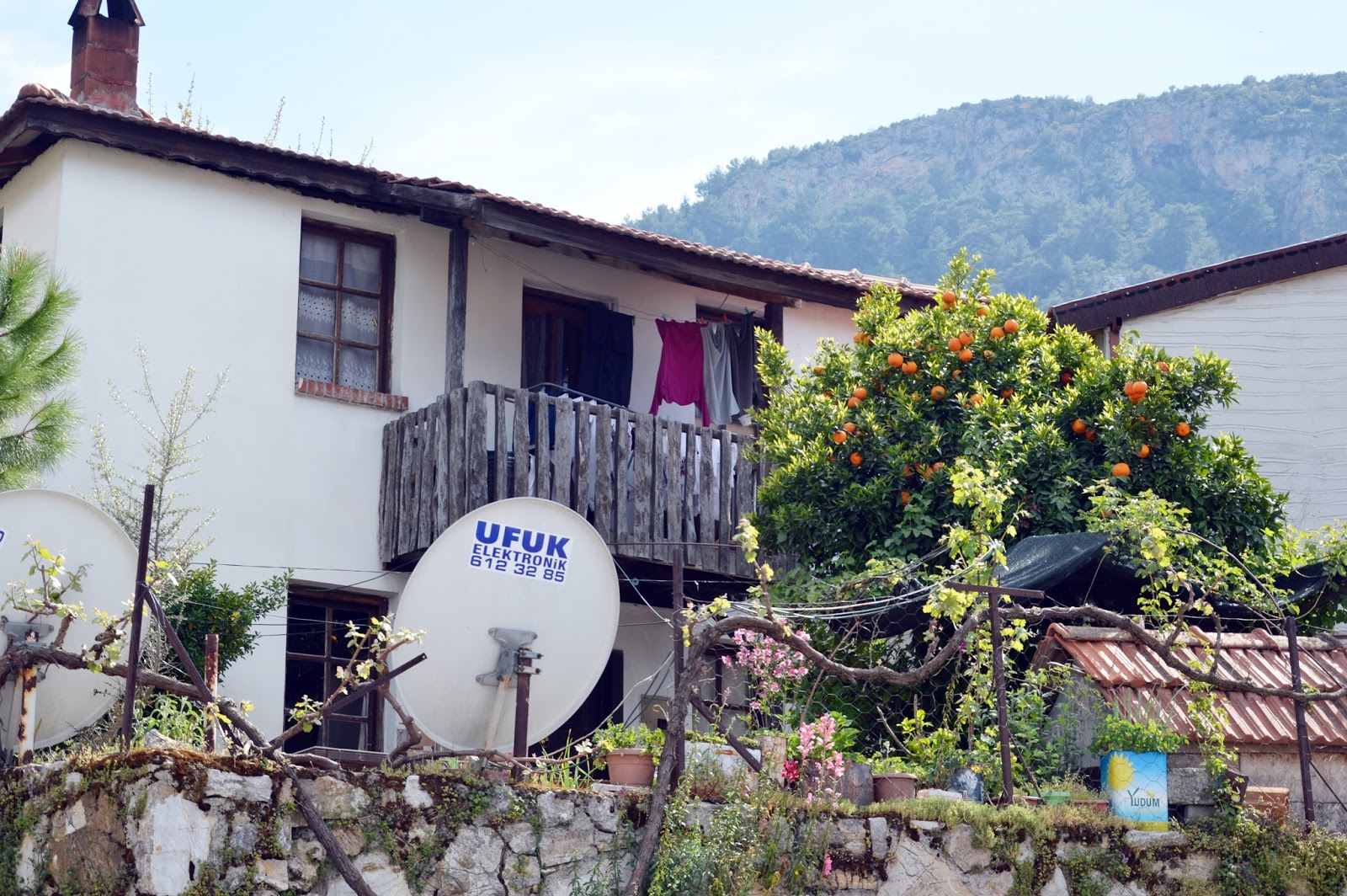 綠葡萄村(Yesil 是「綠」,Uzum 是「葡萄」,一個很夏天,很浪漫的地名,的確,它也是個很迷人的小村落,位在山邊,人口不到幾千,有著純樸的石造小屋,有著純樸的人和寧靜的鄉村生活,距離 Fethiye 不遠,開車二十分鐘就可以到,但雖然距離城市這麼近,這個地方卻更像遺世獨立的小村落,完全沒有城市的喧囂和繁忙,難怪很多外國人選擇來這裡買房子,但這也讓這個地方的房價水漲船高(但怎麼貴還是比台灣便宜多了).